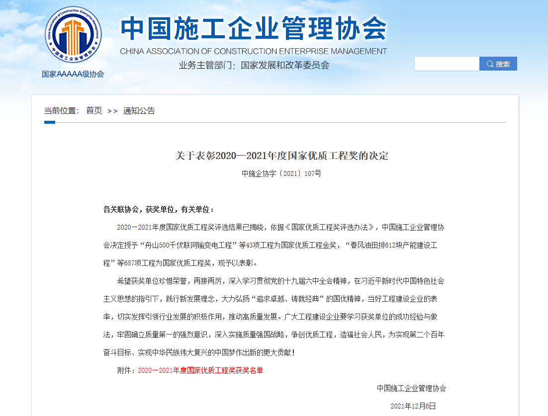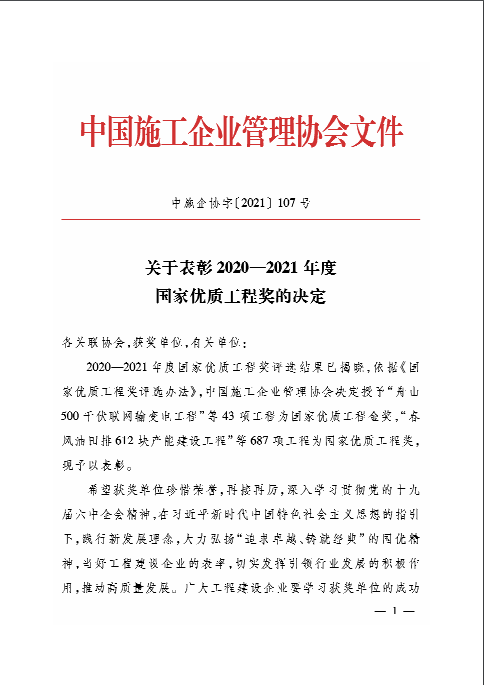 12月6日,中國(guó)施工企業(yè)管理協(xié)會(huì)發(fā)布《關(guān)于表彰2020-2021年度國(guó)家優(yōu)質(zhì)工程獎(jiǎng)的決定》(中施企協(xié)字〔2021〕107號(hào)),由連云港市交通集團(tuán)有限公司建設(shè)的連云港綜合客運(yùn)樞紐站前南廣場(chǎng)及配套、人民路及鹽河路下穿工程喜獲國(guó)家優(yōu)質(zhì)工程獎(jiǎng)。