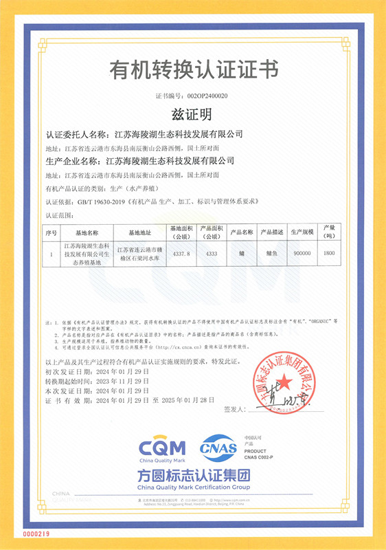 石梁河鳙魚獲得有機轉(zhuǎn)換認證證書